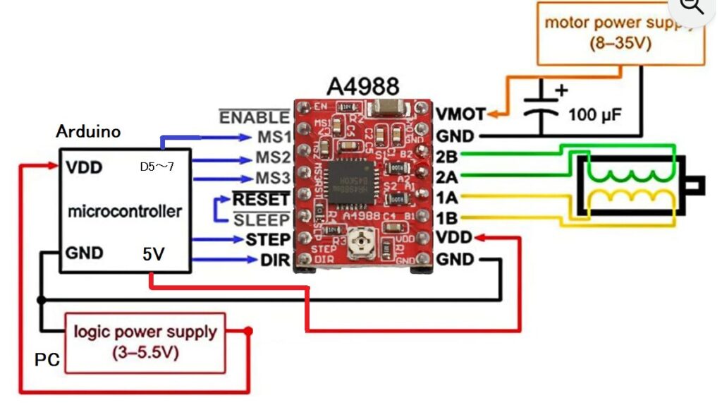 A4988とArduinoの基本的な配線は以下の通りです👇